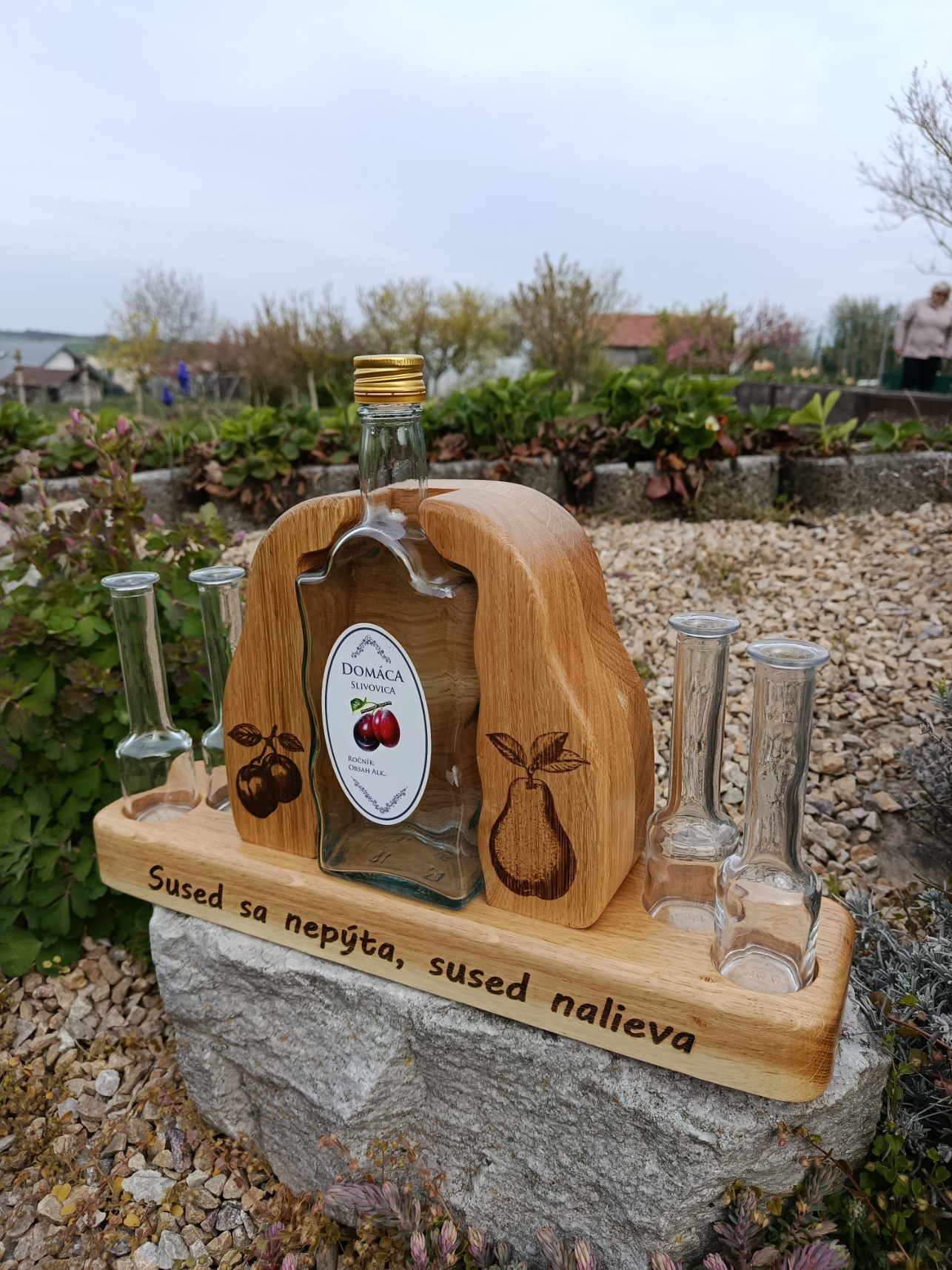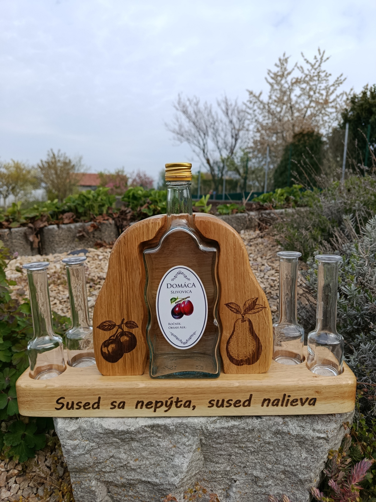 Drevený stojan na destilát v tvare hrušky je originálny darček pre každého muža k životnému jubileu. Je vyrobený z dubového dreva. Je to dekorácia na stôl, policu, do bytu aj na chatu. V stojane je zapustená netradičná fľaša na destilát a dva resp. štyri tradičné slovenské poháriky. Fľaša má objem 0,5 l. Drevený stojan na destilát je ozdobený vygravírovaným ovocím, používaným na destilát. Na základni môže byť vygravírovaný text “Užívaj ma s mierou !”, alebo iný podľa zadania zákazníka. Rozmer je 290x230x90 resp. 390x230x90 mm. Stojan je natretý ekologickým olejom vhodným aj pre styk s potravinami. Tento personifikovaný darček určite poteší každého muža.